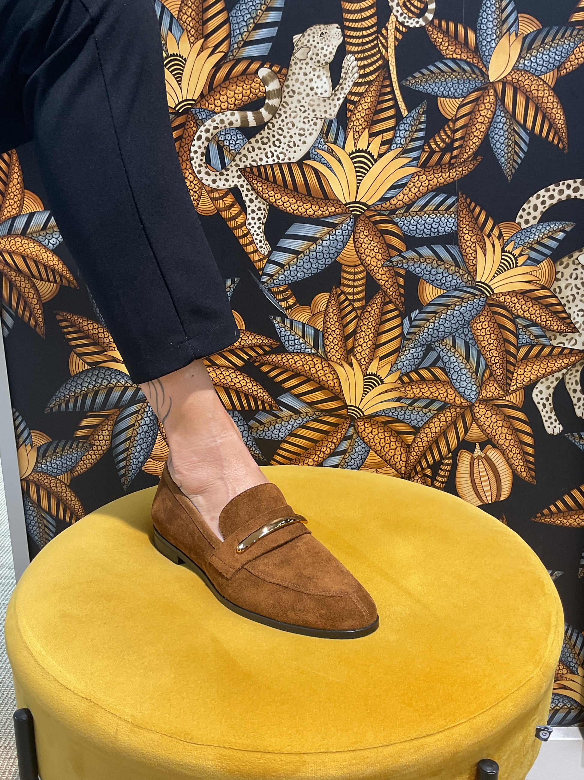 Mocassin en cuir retourné barrette doré, souple, facile à associé.